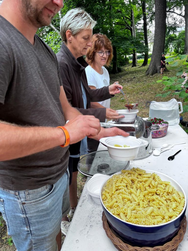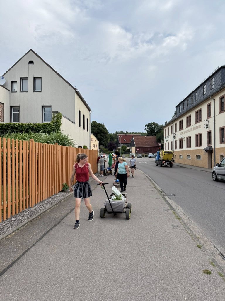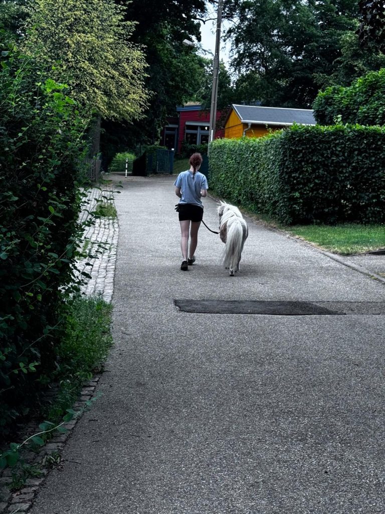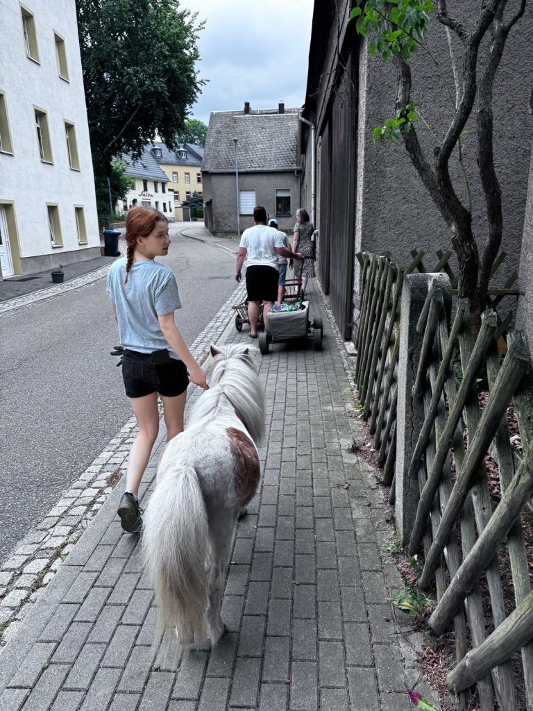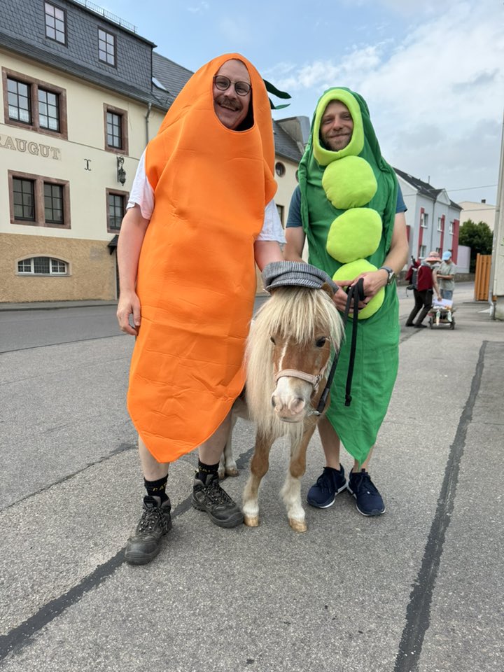Zu einem Umzug der ganz besonderen Art kam es am 3.7. – Big Al, seines Zeichens Ritterriesenpferd im Herzen, wurde zu nachtschlafender Zeit aus dem Heimatgefilde am lauschigen Park entführt. Mit ihm klapperten klapprige Leiterwagen, die offenbar einem Museum für frühe Fahrgeschichte entwendet worden waren, gezogen von kräftigen Lehrkräften und Schülern der SSA Chemnitz, berufsbildende Schulen Lene Voigt . „Solange ich die Dinger nicht ziehen muss“, sinnierte das Pony unter seinem Pony-Pony, „dafür würde ich keine Verantwortung übernehmen! Am Ende reißt noch die Deichsel ab, bei meinen Pferdestärken, und dann war ich’s wieder!“ Die Tatsache, dass sich zwei der Anwesenden (angeblich Lehrer) in Erbsen- und Möhrenkostüme zwängten, ignorierte Big Al stoisch. „Ist der Ruf erst ruiniert“, murmelte er nur leise, kurz, bevor man ihm einen Hut zwischen die Ohren setzte. „So erkennt mich vielleicht niemand. Fenn und Jeronimo lachen sich ja tot.“ Die Karawane zog gemeinsam zum Hort, in dem – trotz des verheißungsvollen Namens „Crazy Kids“ – erstaunlich unkostümierte Kinder warteten. „Es gibt also noch Hoffnung, denn Kinder sind schließlich die Zukunft“, grübelte Biggi, der – von einer Möhre und einer Erbse flankiert- die freudige Begrüßung so würdevoll, wie es unter diesen Umständen überhaupt noch möglich war, entgegennahm. „Darf ich jetzt bitte auf Schleichwegen nach Hause? Ohne Möhre, Erbse und Klapperwagen?“ fragte er vorsichtig nach, als sich die Kinder gruppenweise auf den Weg machten, um auszuprobieren, wie viel Platz ein handelsübliches konventionelles armes Schwein eigentlich zur Verfügung hat, sich beim eierfreien Eierlaufen zu messen und der Karte zum Park zu folgen, wo tonnenweise Nudeln und Bolognese auf die hungrigen kleinen Wanderer warteten. – Mit Erbse, Möhre und Klapperwagen. – „Auf den Schreck erstmal einen Teller Heu und einen Schluck Hartmannsdorfer Rohrperle“, murmelte er. „Bloß gut, dass ich nicht als Knoblauchzehe durch den Ort toben musste.“ – Dem bunten Treiben der Crazy Kids sahen alle drei Ponys und die Seniorenbrigade „Zickezacke, Zickezacke, Heu Heu Heu“ aus sicherer Entfernung zu. Großen Anklang hinterm Zaun, vorrangig bei den Ponys, fand das Steckenpferd-Turnier: „Ich hab noch nie verstanden, warum Pferde Leute, die über Hürden wollen, über Hürden schleppen müssen“, sagte Fenn nachdenklich. „WIR wollen da ja meistens gar nicht drüber.“ „Wetten können wir trotzdem, es heißt ja Pferdewette“, rief Schaf Moritz, klappte den Klapptisch aus und eröffnete geschäftig das Wettbüro. „Ihr Einsatz, meine Damen und Herren?“
