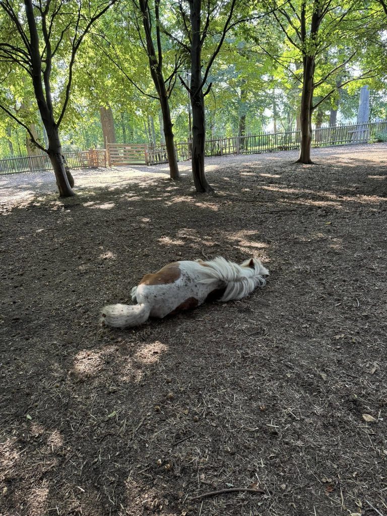 Heute nehmen wir Euch mal vorsichtig mit zu unseren Senioren und den Ponys. Und heute erzählen wir euch auch, dass wir seit Monaten um Jeronimo kämpfen. Nachdem wir endlich die Diagnose hatten (Muskeldystrophie), konnten wir beginnen, mit gezielter Fütterung dagegenhalten. Unser Pony baute immer weiter ab, jetzt haben wir diesen Prozess zumindest erstmal stoppen können. Das ist sehr aufwendig, aber auch sehr notwendig. – In diesem Zusammenhang appellieren wir wieder DRINGENDST an alle, NICHTS Fressbares über den Zaun zu reichen – jede gut gemeinte Aktion wirft das Pony wieder zurück!!!! – Damit ein bisschen Leben in die Bude kommt, ist Big Al kürzlich eingezogen. Die wolligen Nachbarn tragen alles mit der nötigen Fassung und genießen den Tag, an dem es ausnahmsweise mal nicht so heiß ist…